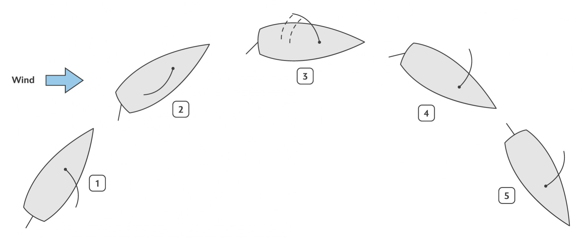 There are several sailing manoeuvres, such as tacking, gybing, heaving to, quick stop, safety position, head to wind, and the sailing clock.However, the two most important ones to learn first are tacking and gybing. |